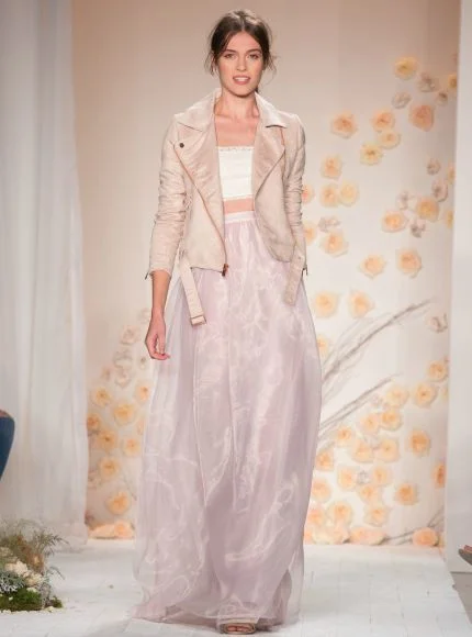 If there is one thing you can not say about Conrad’s first runway collection is that it wasn’t pretty. It was a modern fairytale come to life, but instead of matching their tulle skirts with glass slippers, the models rocked leather jackets. Models were also styled with pinnable crown braids and loose ponytails, and delicate floral prints dominated. There was even a ‘Jolene’ remix playing in the background as the models hit the runway.